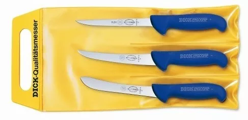 3 az 1-ben készlet, mely egy 15 cm-es egyenes flexi csontozókést, egy 15 cm-es ívelt csontozókést és egy 15 cm-es henteskést tartalmaz.