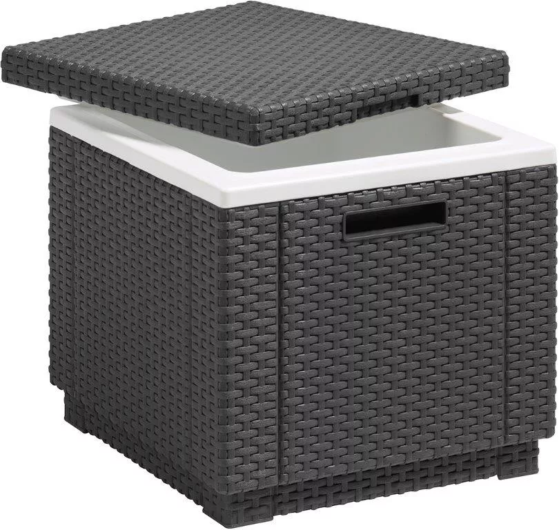 Az Ice Cube kültéri tárolódoboz a Keter márkától többfunkciós használatra készült. Nemcsak praktikus kisasztalként funkcionál, de ülőhelyként is használható a pergola alatt. Hideg italra vágyik? Csak vegye le a fedelet, helyezze bele az üdítőket, gyümölcsleveket vagy sört, és élvezze, hogy nem kell állandóan a hűtőhöz szaladgálni.