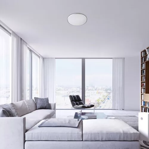 A nagyméretű, kerek Engon mennyezeti lámpa bármely modern nappaliba vagy hálószobába megfelelő választás lehet. Az egyszerű, vékony kialakítású modell diszkréten simul bele a mennyezet síkjába. Azok számára, akik a különleges dizájnnal szemben a funkciót részesítik előnyben, tökéletes választás ez a lámpa. Az Engon ezüst színben fehér búrával, teljes egészében műanyagból készül, és a G energiaosztályba tartozó beépített LED fényforrással rendelkezik, amelynek a teljesítménye 24 W, fényereje búrával 1620 lumen, búra nélkül 2600 lumen, élettartama pedig 25 000 óra. A mennyezeti lámpa színhőmérséklete 4000 K, természetes fehér fénye tiszta, modern hatást eredményez. Az Engon átmérője 380 mm, mennyezettől mért távolsága pedig 67 mm.