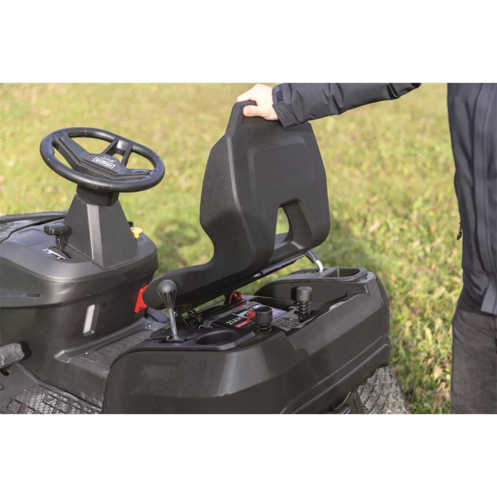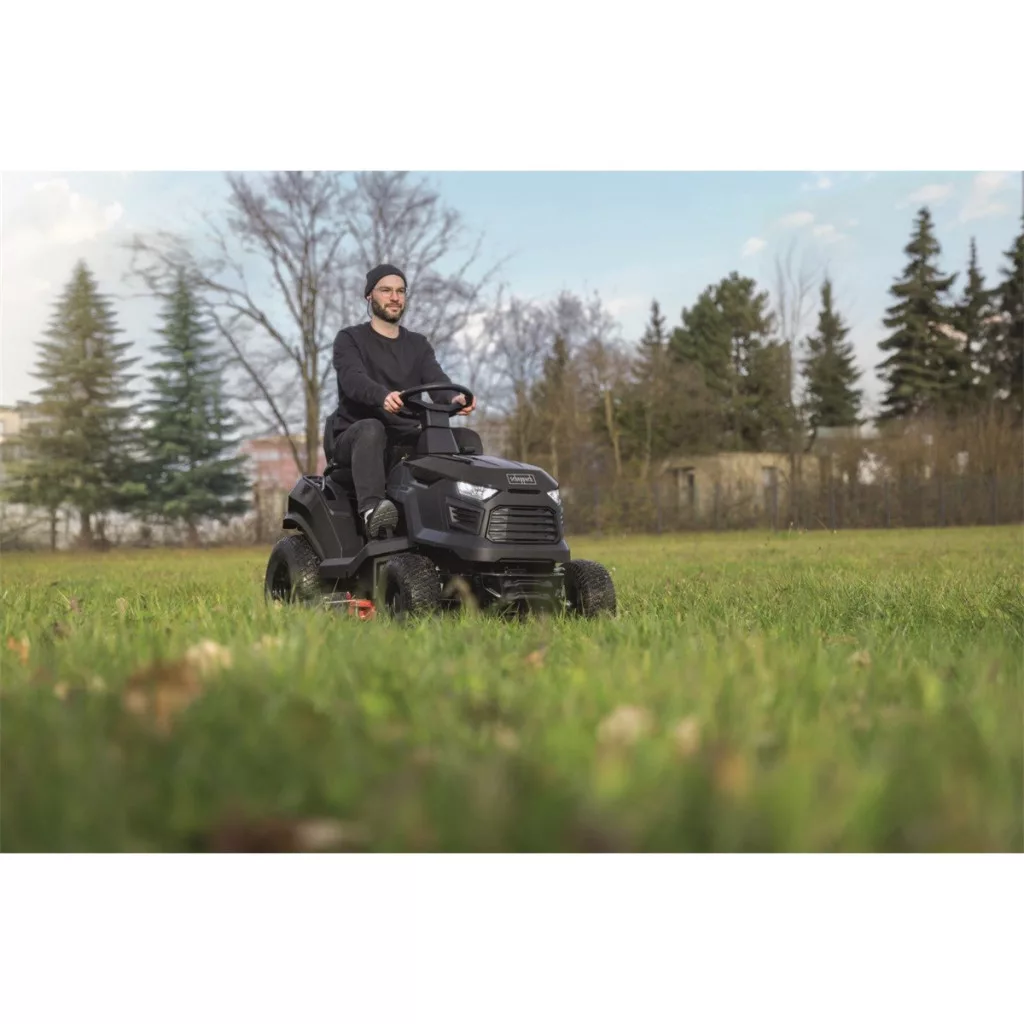 A 98 cm-es vágásszélességű Scheppach benzinmotoros kerti traktor megbízható segítőtárs az akár 5000 m2-es nagy fűfelületek gondozásában. A nagy teljesítményű, 15,5 LE teljesítményű és 452 cm3-es, négyütemű motor még a sűrűbb és túlburjánzó növényzettel is megbirkózik, a praktikus elektromos indítófunkciónak köszönhetően pedig gyorsan és könnyedén beindíthatja a gépet. A robusztus, acél kétkéses vágószerkezet tiszta és egyenletes vágást garantál. A vágási magasság kényelmesen, központilag állítható 7 fokozatban 3 és 7 cm között, így az eredményt könnyedén az aktuális körülményekhez és a gyep kívánt megjelenéséhez igazíthatja. A praktikus oldalsó kidobás lehetővé teszi a folyamatos nyírást ürítési igény nélkül, amit különösen nagy területeken vagy magasabb fű nyírásakor fog értékelni. A traktor vonószemmel is fel van szerelve további tartozékok csatlakoztatásához, ami jelentősen bővíti a kertben és a ház körüli használati lehetőségeket. A karbantartást megkönnyíti az üzemóra-számláló és az integrált vízcsatlakozás, amely lehetővé teszi a vágószerkezet gyors és egyszerű tisztítását munka után. A LED-fényszórók jó rálátást biztosítanak a munkaterületre még rossz fényviszonyok között is. Az ülés alatti biztonsági kapcsoló pedig maximális védelmet nyújt munka közben. A nagyméretű kerekek stabil tapadást és csendes menetet garantálnak még egyenetlen terepen is. A folyamatos sebességszabályozás lehetővé teszi a munkatempó rugalmas beállítását - akár 10 km/h előre és 6 km/h hátra, sebességváltás nélkül. A tartós hidrosztatikus váltó sima erőátvitelt, kényelmes irányítást és a teljes gép hosszú élettartamát biztosítja.