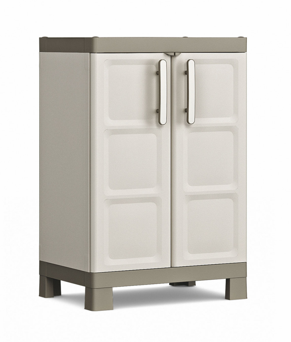 A karbantartásmentes Keter Excellence Low tároló szekrény magas ellenállással a légköri hatásokkal és mechanikai elhasználódással szemben és lezárás lehetőségével használható háztartásban, garázsban, pajtában, pincében, tető alatt vagy bárhol máshol. A szekrény magas lábakkal van ellátva a beltérben lévő padlók egyszerű és praktikus tisztítására, amit értékelni fog a takarításnál.