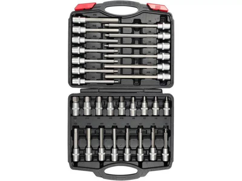 30 darabos HEX imbuszkulcs készlet csavarok lazítására kialakítva. Autószervizekben, építkezésekben, gyártásban és mezőgazdasági gépekben használatos. Anyag: S2 és CrV Szatén króm felület Méretek: 55 mm hosszúság: 5, 6, 7, 8, 10, 12, 14, 17, 19 mm 100 mm hosszúság: 5, 6, 7, 8, 10, 11, 12, 13 mm 140 mm hosszúság: 5, 6, 7, 8, 10, 12, 14 mm 200 mm hosszúság: 5, 6, 7, 8, 10, 12 mm Szerszám nyél: 1/2' (12.7 mm) Praktikus hordozható tokban szállítva Használati figyelmeztetések: Vigyázat! Mindig használjon személyes védőfelszerelést a munka során.