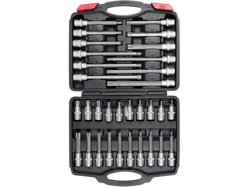 Egy 32 TORX csillagkulcs készlet, csavarok lazítására tervezve. Autó szervizben, építkezésen, gyártásban és mezőgazdasági gépekben használható. Anyag: S2 és CrV Satírozott króm felület Méretek: Hosszúság 55 mm: T20, T25, T27, T30, T40, T45, T50, T55, T60, T70 Hosszúság 100 mm: T20, T25, T27, T30, T40, T45, T50, T55, T60, T70 Hosszúság 140 mm: T40, T45, T50, T55, T60, T70. Hosszúság 200 mm: T40, T45, T50, T55, T60, T70 Szerszám nyél: 1/2' (12.7 mm) Praktikus hordozótáskában csomagolva Használati figyelmeztetések: Figyelem! Mindig használjon személyes védőfelszerelést a munka során.