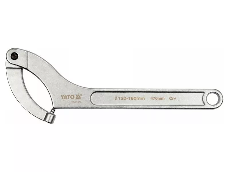 YATO YT-01679 márkájú horogkulcs kerek csavarral, artikulált YT-01679.Készült tartós CrV króm-vanádium acélból. Matt króm bevonat a kulcs felületén. Flansek, gyűrűk és csapágyak karbantartására tervezett.