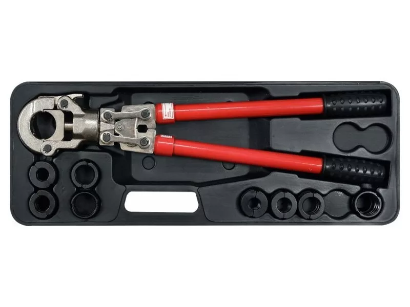 Kézi hidraulikus présgép PEX-AL-PEX, PERT-AL-PERT csövek illesztékeinek préselésére 8 db présforma készlettel. A présgép hidraulikus hengerrel van felszerelve, amely lehetővé teszi az illesztékek pontos és szoros préselését 60 kN erővel. A 360°-ban forgatható fej lehetővé teszi a nehezen hozzáférhető helyeken való munkavégzést. A teleszkópos fogantyúk kinyújthatók 57 cm-ről 80 cm-re, így csökkentve az illeszték préseléséhez szükséges erőt. A gyorsformáváltó rendszer lehetővé teszi a présformák könnyű cseréjét szükség szerint. A présgép a következő csatlakozók készletével van felszerelve: U típus: 16 mm / 20 mm / 25 mm / 32 mm. TH típus: 16 mm / 20 mm / 26 mm / 32 mm Ez lehetővé teszi a legnépszerűbb csatlakozórendszerekkel való munkavégzést. Alkalmazás:A présgép PEX-AL-PEX vagy PERT-AL-PERT csövek illesztékeinek préselésére lett kifejlesztve: U - 16 mm / 20 mm / 25 mm / 32 mm TH - 16 mm / 20 mm / 26 mm / 32 mm A csomag tartalma: présgép U-típusú matriz: 16 mm / 20 mm / 25 mm / 32 mm TH-típusú matriz: 16 mm / 20 mm / 26 mm / 32 mm tárolódoboz Figyelmeztetés használatkor: A kéziszerszámok használata veszélyes lehet! Mindig használjon személyes védőfelszerelést munka közben. Csak megfelelő, sérülésmentes eszközöket használjon. Válassza ki a szerszám típusát és méretét a tervezett alkalmazásnak megfelelően. Ne terhelje túl a szerszámokat. Tartsa a szerszámokat távol a gyerekektől. Gondosan használja a szerszámokat.