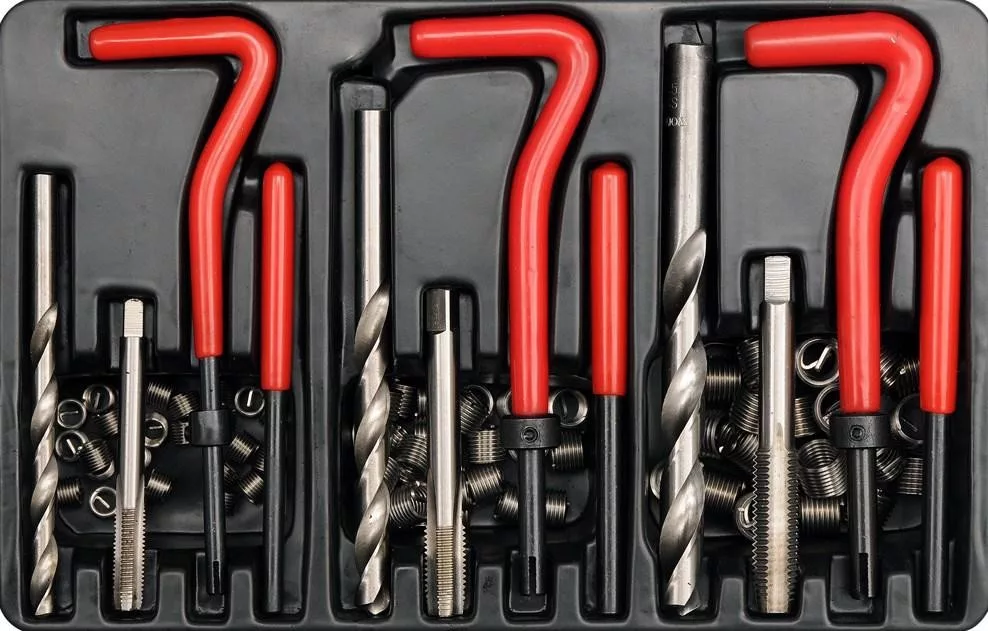 Professzionális M6 - M10 menetjavító készlet. A fúrók és menetvágók HSS 4341 gyorsacélból készülnek. Egyenletesen vágják a menetet, amibe egy kemény rozsdamentes acél spirális betét kerül. A betét behelyezéséhez vezető gombot és egy olyan ütőgépet használnak, ami eltöri a betét kiálló végét. Használati figyelmeztetések: Figyelem! Mindig használjon személyes védőfelszerelést a munka során.