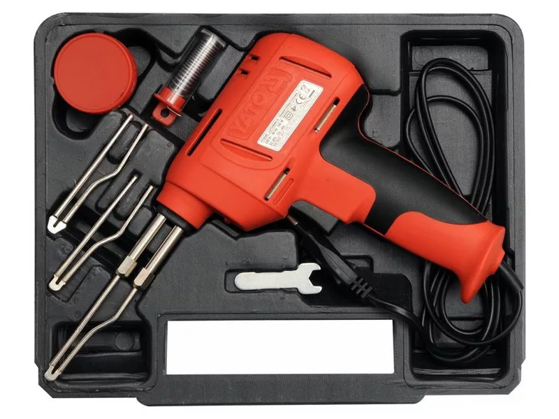 Az YT-8245 transzformátoros forrasztópisztoly nagyon nagy teljesítményű, kiváló minőségű anyagokból készült, ergonomikus formával. A munkaterület pontvilágítása és a csúszásmentes anyag a markolaton pozitív hatással van a munka kényelmére. A 180W teljesítmény nagyon gyors felmelegedést garantál. A forrasztópisztoly a csomagban lévő első forrasztóhegy segítségével kb. 15 másodperc alatt éri el a 350°C-ot. Teljesítmény: 230V, 180W. A készlet tartalmaz: három cserélhető hegyet, amelynek átmérője a rögzítési pontnál - 3,35 mm, paraffint, óntartályt. A forrasztópisztolyhoz csatolt forrasztóhegyek nagy hőkapacitással rendelkeznek egy transzformátoros forrasztópisztolyhoz képest, így még ilyen magas teljesítmény mellett is a felmelegedési idő szobahőmérséklettől 350°C-ig kétszer olyan hosszú, mint az YT-82451-es modellnél alapheggyel. A nagy hőkapacitású nyílhegyek előnyét észre fogja venni nagy forrasztási pólusokról történő alkatrészek leforrasztásakor, vagy nagyobb keresztmetszetű vezetékek összekötésekor. Ha az ember alap formájú hegyet használna, ekkor a felmelegedési idő nem haladja meg a 10 másodpercet. HOGYAN ÁPOLJUK A HEGYET Az YATO transzformátoros forrasztópisztolyainak rotorjai olyan anyaggal vannak bevonva, amely csökkenti a hegy oxidációját. Az értelmetlen túlmelegedés és a mechanikai sérülések gyorsan rontják a védőréteget, ekkor a hegy oxidálódik, ami problémákat okoz a forrasztópont olvadásában. Az ón helyett, ami olvad és ragad a forrasztóhegyre, a forrasztópisztoly pehelyszerűen hullik le. A hegy ápolásának bevált módja az ónozás. Amikor először melegíti fel a forrasztópisztolyt, tegyen egy kis ónt a hegyre, majd távolítsa el a felesleget, például sárgaréz forgáccsal. Az így képződött ónréteg megvédi az oxidációtól. Jó gyakorlat minden munka befejezése után ónozni a hegyet. FIGYELMEZTETÉS A transzformátoros forrasztópisztolyok viszonylag kis méretüket az áramszünetes működésű transzformátor építési technológiájának köszönhetik. A készülék legmagasabb teljesítményének fenntartása érdekében be kell tartani a következő szabályt: 12 másodperc forrasztás 48 másodperc szünet Ha meghaladja a forrasztási időt, miközben betartja a hegy ápolásának elveit, az nem lesz káros hatással a forrasztópisztoly további működésére, különösen, ha hagyja a készüléket lehűlni. A túlmelegedett transzformátorban csökken a transzformátor hatásfoka, és ezért csökken a forrasztóhegy megfelelő hőmérsékletre való felmelegítésének képessége. A túlmelegedett transzformátorban nő a károsodás veszélye. Egy hagyományos, folyamatos működésű transzformátor ilyen magas teljesítménnyel több kilogrammot is nyomna, és méretében inkább egy kis hegesztőhöz hasonlítana, mint egy praktikus pisztoly formájú forrasztópisztolyhoz.