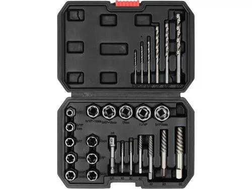 Univerzális 26 darabos csavarkiszedő szett, csavarok, tüskék és anyák kicsavarására tervezve. Javasolt mechanikus és autóipari szolgáltatásokhoz. tartalmazza: csavarhúzók: 1/4', 8 mm, 3/8', 10 mm, 11 mm, 12 mm, 1/2', 13 mm, 14 mm, 16 mm, 17 mm, 11/16', 19 mm csavarhúzók: 1#, 2#, 3#, 4#, 5#, 6# fúrók: 2.4mm, 3.2mm, 4mm, 6.4mm, 7.2mm, 9.5mm hosszabbító 3/8' to HEX elemek készülték minőségi CrMo acélból HRC 47-50 keménységgel és HSS 4341
