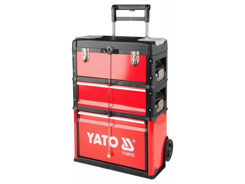 Moduláris 3-részes szerszámos szekrény. A készlet tartalmaz egy alsó dobozt beépített kerekekkel, kihúzható alumínium fogantyúval és egy nagy, kihúzható fiókkal. Az alsó modul teherbírása 15 kg, méretei 410x210x280 mm. A középső modulban található 1 fémből készült fiók, amelynek teherbírása 10 kg, méretei pedig 390x215x130 mm. A fiók golyóscsapágyas fém sínre van szerelve. A felső modul egy klasszikus szerszámosláda, méretei 420x220x150 mm, teherbírása 20 kg. Beépített 2 kihúzható szervezővel és szerszámtálcával rendelkezik. A modulok teteje lapos, amelyet munkafelületként is lehet használni. Ezen kívül rendelkeznek egy nagyon hasznos horonnyal fúrás vagy csavarozás céljából. Emellett a moduloknak kényelmes csúszásgátló fogantyújuk, oldalsó fogantyújuk a könnyű emeléshez és csúszásgátló alsó sarkuk van.Lehetőség van a 3-modulos készlet 4 modulossá bővítésére a YT-09107 vagy YT-09108 középső modul hozzáadásával. A fő és középső modulokon fémszerelvények vannak a készletek összekapcsolásához, az alumínium fogantyú pedig további zárral rendelkezik a modulok rögzítéséhez. A YATO szerszámtálcákba előre elkészített szerszámkészleteket lehet betenni.