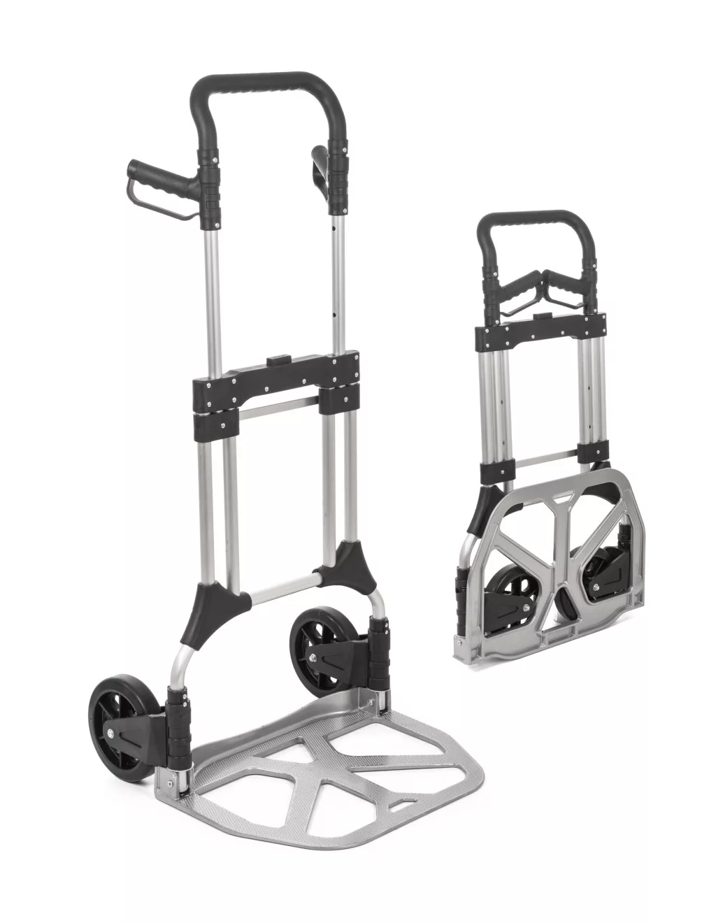 A teljesen alumíniumból készült váz könnyű, mégis rendkívül tartós. Könnyedén elbír akár 200 kg terhet is, még egyenetlen felületeken is. A teleszkópos fogantyú a megfelelő magassághoz igazítható, így kényelmes munkát és szállítást biztosít. A 20 cm átmérőjű kerekek zökkenőmentes mozgást és jó ütéselnyelést biztosítanak. A tágas rakodófelület 42,5 × 59 cm bőséges helyet nyújt a nagyobb tárgyak számára is. Összecsukva a kézikocsi mérete 59 × 107,5 × 9 cm, így könnyen elfér egy autó csomagtartójában vagy a raktárban. Teljes tömege 11 kg.